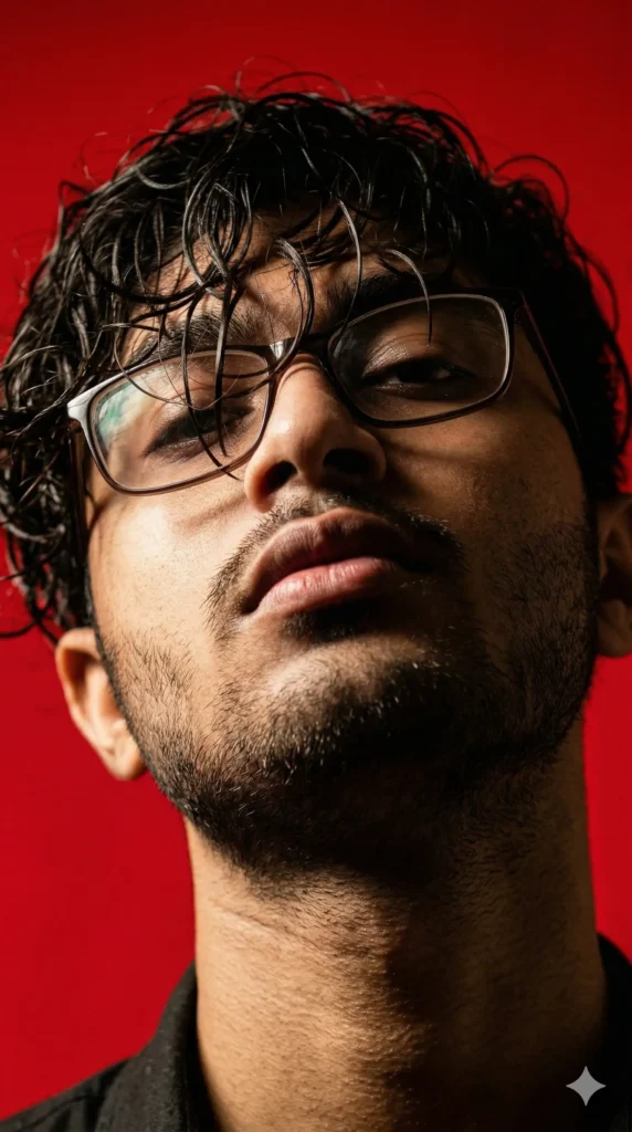 cinematic editorial close-up portrait of a young man, low-angle shot with his head tilted slightly back, intense saturated red background (solid color field), messy wet-look curly hair falling over the forehead and partially covering one eye, sharp jawline with short stubble beard and mustache, lips slightly parted, strong hard key light from the side creating deep sculpted shadows across the face and neck, ar 9:16