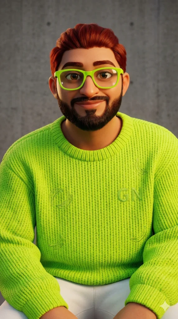 3D in the style of Disney-Pixar, a man in fluorescent green glasses, a man focused but smiling, red hair in a large neon green knitted sweater, white trousers, gray concrete background in the background, warm cinematic lighting, high detail, 8K, without text and numbers. The image is made with high detail, with subtle highlights of light on a glossy translucent body, which corresponds to the warm cinematic lighting of the stage, front view, portrait ar 9:16