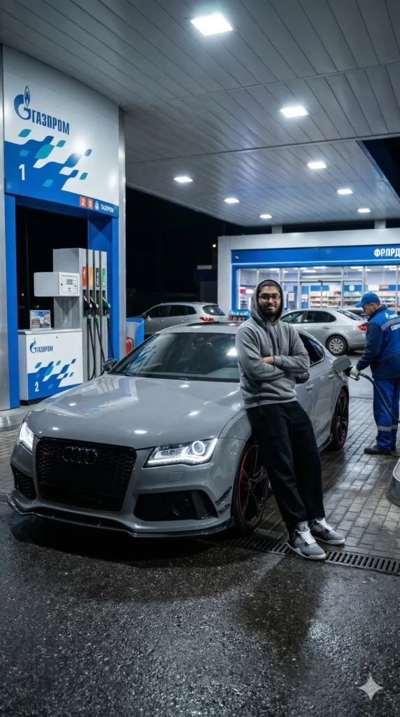 “ГАЗПРОМ” SIGN VISIBLE. A MODERN FUEL PUMP WITH A NUMBER, OTHER CARS PRESENT, AND A STATION ATTENDANT FUELING THE VEHICLE. THE GAS STATION’S SHOP IS VISIBLE, WITH COLD WHITE LIGHT FROM THE CEILING PANELS, A DARK BACKGROUND, AND AN INDUSTRIAL ATMOSPHERE.
