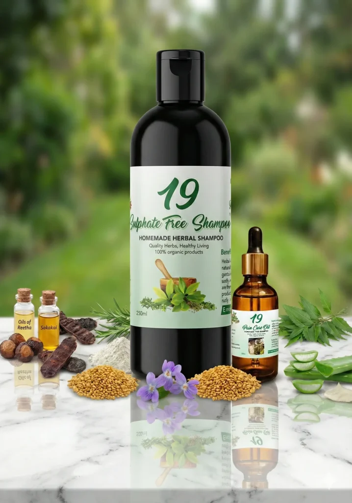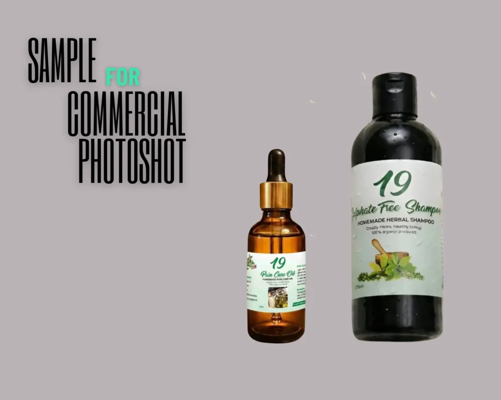 Enhance this product photo for a high-end luxury catalog. Sharpen fine material textures—leather, metal, or fabric—to create a realistic, tactile feel. Remove any yellow or warm color cast from indoor lighting for clean, natural tones. Add a soft, subtle reflection beneath the product to give it depth and visual weight. Apply professional studio lighting with crisp details and a premium finish, make shampoo bottle bigger and pain oil bottle small.