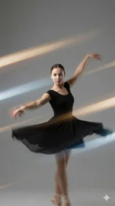 Add an image of explosive motion to this photo of a dancer. Simulate realistic motion blur trailing from their hands and the edge of their dress, as if they just completed a full spin. Keep their face and core body relatively sharp as the primary focal point, preserving facial detail and expression. Extend soft, directional blur along the arms, fingertips, and dress hem to suggest centrifugal force. In the background, add 2–3 subtle, out-of-focus light streaks with gentle bokeh — slightly angled to reinforce the sense of rotation and energy. The overall mood should feel cinematic and editorial, like a high-end dance performance captured mid-movement.